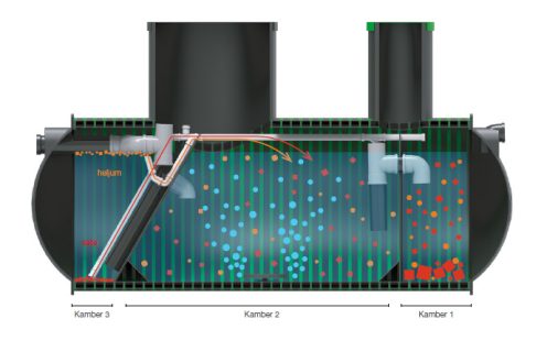 Vees säilinud rasked osakesed settivad siin põhja ja hõljuvad osakesed kerkivad pinnale. Ülemise vee tasapinna ja kambri põhja vahel asuvast väljavoolutorust väljub puhastatud vesi. Kolmanda kambri setted ja heljum pumbatakse kord ööpäevas tagasi eelmisesse kambrisse, kus see läbib puhastusprotsessi uuesti.